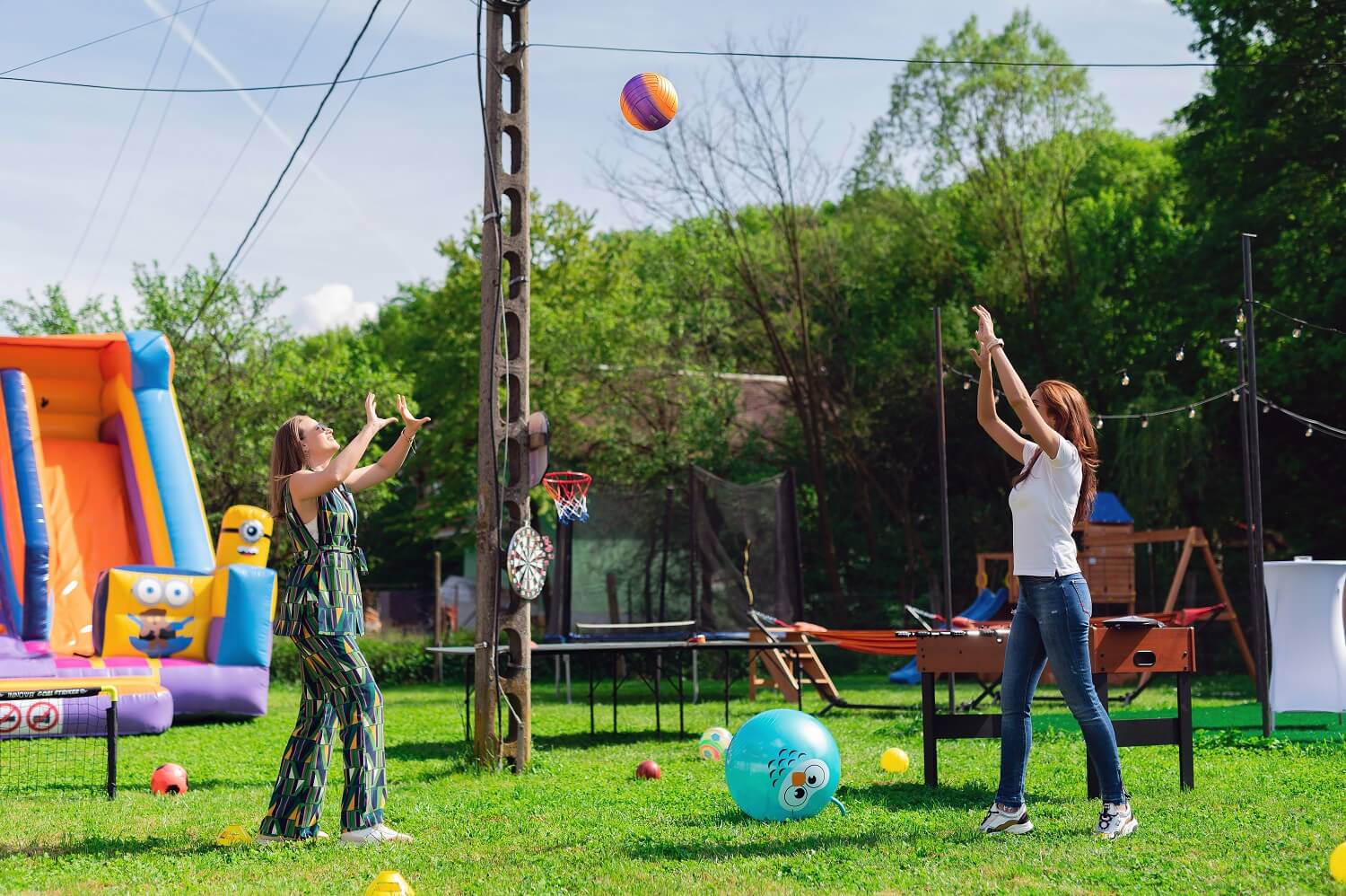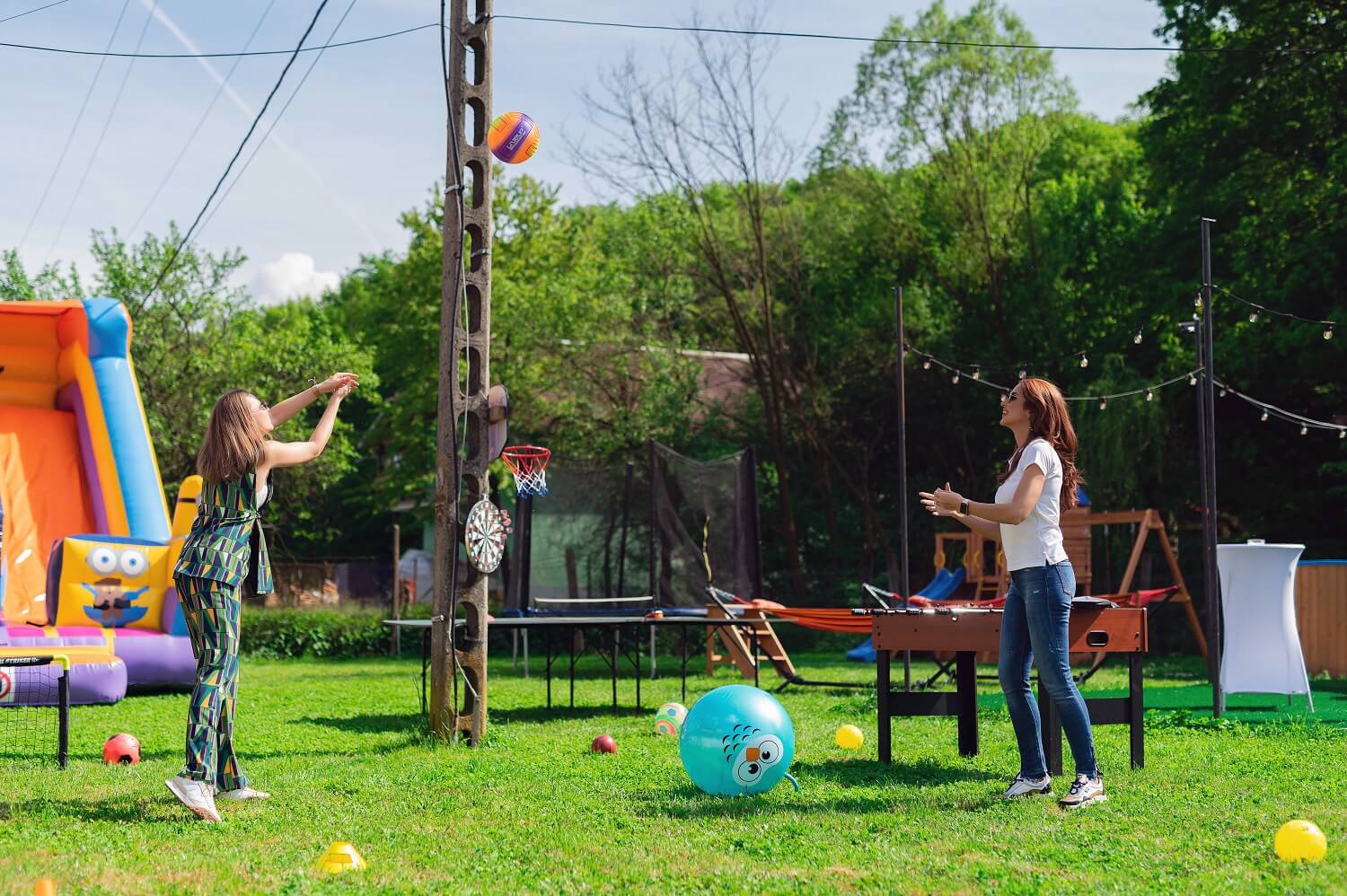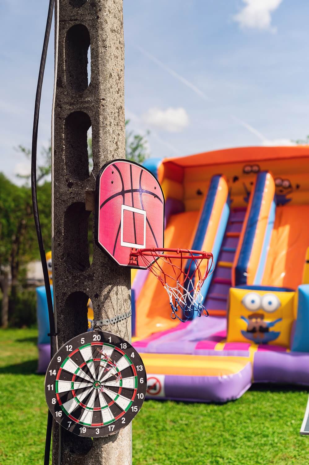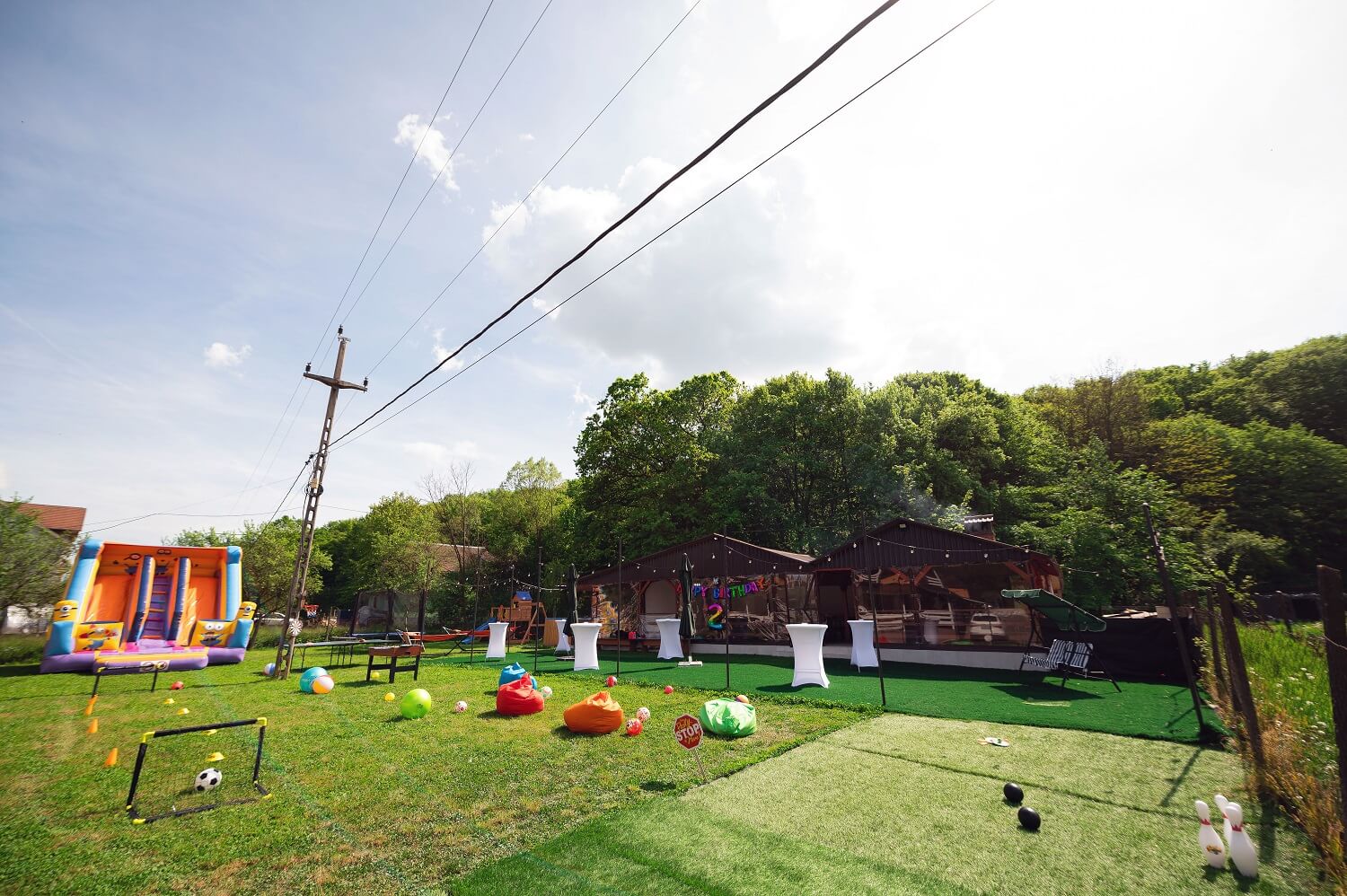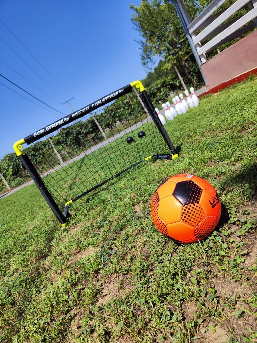 Locul special amenajat pentru energia oricarui copil compus din: casuta din lemn cu 2 leagane si topogan, trambulina, mini teren de fotbal, cos de baschet, bowling pe iarba, badminton, darts, tenis de masa, masa de fotbal.