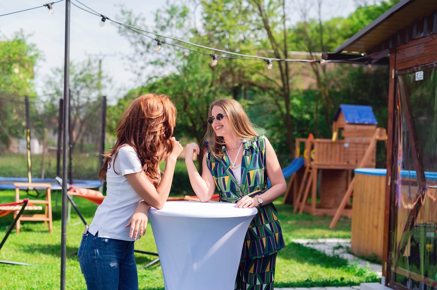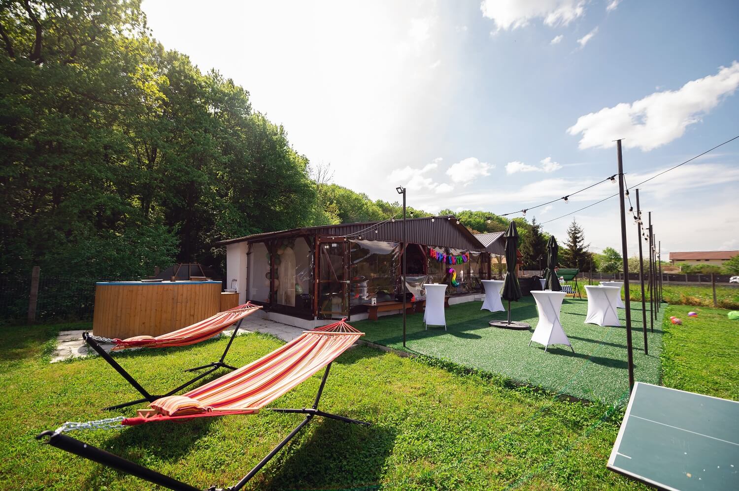 Spatiul deschis creat pentru relaxare si socializare format din: mese cocktail tip inalt, fotolii de gradina, balansoare, hamac si ciubar tip jacuzzi.